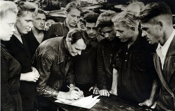 Тракторостроители единодушно ставят свои подписи под Воззванием о запрещении атомного оружия. Активно прошел сбор подписей на главном конвейере. Стахановец – сборщик тракторов Щербаков подписывает Воззвание.