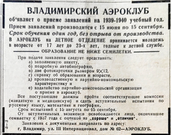 «С 1 февраля Владимирский аэроклуб открывает прием в спортивно-парашютное отделение. На этом отделении наша молодежь может получить почетное звание спортсмена-парашютиста, добиться права носить значок, который носят тысячи молодых патриотов нашей прекрасной родины. Инструктор-парашютист аэроклуба Железнов» («Призыв», 1 февраля 1939).