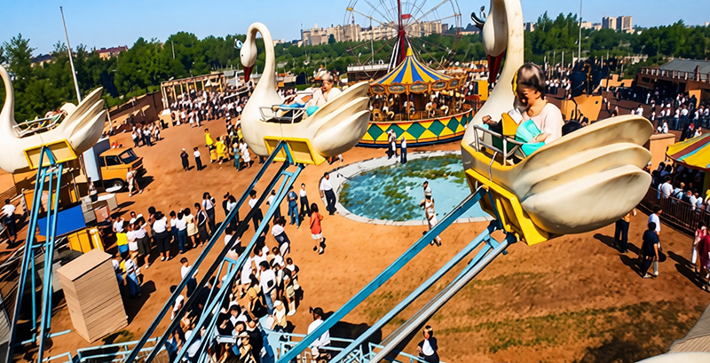 На маленькой территории, с трудом вмещающей такую массу людей, расположился целый парковый городок: аттракционы, карусели, комната неожиданностей…