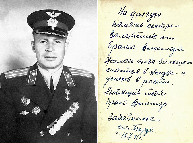— Вот, какое мне письмо прислали из части. Отца, Андрея Захаровича, тогда не было. Он ведь тоже воевал. И у него есть правительственные награды. Солдаты, сержанты и офицеры авиационного полка, в котором служил Виктор, писали: «Дорогая Наталья Федоровна! Мы знаем, что все ваши чувства и мысли витают вокруг сына. Этим Вы сбережете своего богатыря. Верьте нам, он вернется с победой, войдет в родной дом, обнимет, расцелует Вас и скажет: «Я выполнил свой долг перед Родиной». Желаем Вам, дорогая Наталья Федоровна, жить долгие годы и воочию увидеть вашего дорогого сына». — Как приятно и радостно было получить такую весть старой рабочей матери. Быстро смахнув набежавшую слезу она продолжает: — Мне хочется пожелать всем летчикам страны хорошего здоровья и долгих лет жизни. Сердечную благодарность выражаю великому Сталину за его неутомимую заботу о своих соколах» («ВК», 21 июля 1949).