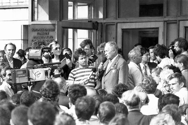 Шамов Игорь Васильевич - Председатель Владимирского горисполкома с 1990 по 1991 г., Глава администрации города с 1991 по 2002 г. Первая сессия горсовета. Депутаты в зале заседаний. ДК завода "Точмаш". Апрель 1990 г. Митинг у здания Владимирского горисполкома. 20 августа 1991 г. Фото: Дрейзин Юрий Владимирович