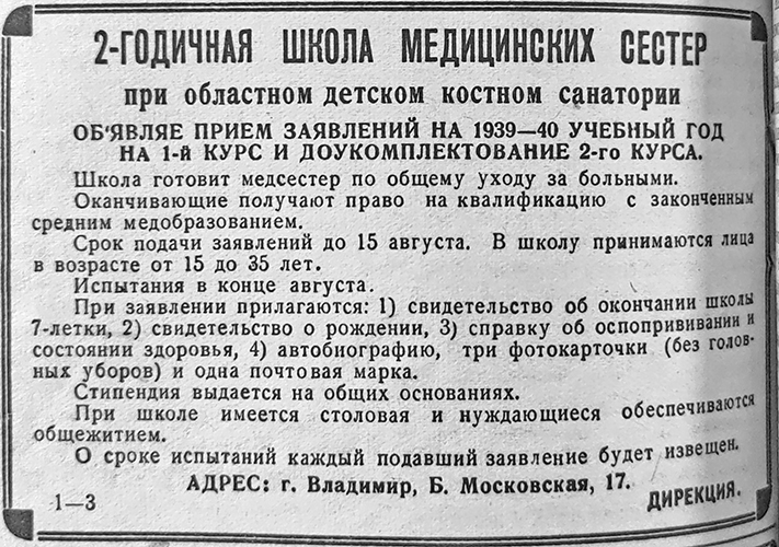 «С 13 июля во Владимире вновь открыт детский туберкулезный санаторий. Он рассчитан на 60 мест» («Призыв», 15 июля 1943).
