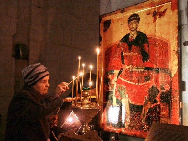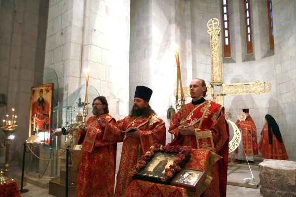 Мощевик св. Дмитрия Солунского. XI в. Византия. Копия Сосуд с фрагментом византийского стеклянного флакона XII в. Реконструкция. Накладка в форме дракона. Кон. XII – нач. XIII вв. Св. Дмитрий Солунский. XIX в. Латунь, литье, финифть.