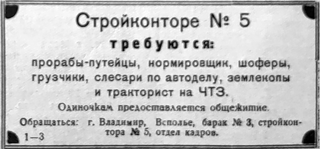 Поступающие на работу рабочие проходят обучение на заводах города: ОЗПО, Автоприбор, завод №521 (Грамзавод) и на Горьковском Автозаводе. «В сентябре (1943) объявили прием на завод №303. Я без проблем уволился из артели и пошел на Всполье. Там нашел отдел кадров уже не завода №303, а тракторного завода. Отдел кадров находился в деревянном 2-этажном доме (его сейчас нет). Меня в отделе кадров оформили в механосборочный цех токарем. Утром, придя на завод, я впервые вошел в корпус цеха, который показался мне очень большим. Цех оказался и очень пустым - там работали только такелажники и монтажники, которые устанавливали оборудование. Я нашел начальника цеха, им был Барышников, который направил меня к табельщице для оформления. Итак, на следующий день я вышел на работу. Я обрадовался, так как меня сразу поставили к станку. Мне дали первое задание - сделать какие-то небольшие шпильки с резьбой с двух концов. Мой первый станок был новый универсальный токарный станок американского производства «Портер». Его я освоил довольно быстро с помощью мастера Смирнова, тоже токаря, года на 3 постарше меня, но имевшего уже опыт работы токарем. В цехе было очень мало народу, а новое оборудование устанавливалось ежедневно, в основном американское, да и инструмент тоже был американским. Механосборочный цех рос как на дрожжах, в нем первое время сосредоточился весь тракторный завод. В нем было все - и термичка, и кузница, и автоматы, и прессы. Здесь же шла сборка изделий. В самом Владимире кадров для завода не было. Многим жителям не хотелось идти на завод в такую даль полем, в стужу, грязь, жару. Кадры на завод стали собирать добровольно-принудительно. Была мобилизована молодежь от 14 до 17 лет. Это были мальчишки и девчонки из деревень всей Ивановской области. Часто ребята из деревень убегали с завода домой, но их возвращали, при этом вырезали часть талонов из хлебных карточек, как мы говорили, «делали штаны». Так как я работал хорошо, и быстро освоил станки, то меня уже через месяц, то есть 10 октября 1943 г., назначили приказом по заводу помощником мастера с окладом в 660 рублей. В обязанности помощника мастера входило: помощь новичкам в освоении станков, наладка станков. Станки были разнообразные: токарные, карусельные, сверлильные, шлифовальные, фрезерные, долбежные и другие. Несмотря на все трудности с кадрами, механосборочный цех стал набирать темпы. В организации работы очень помог присланный к нам опытный инженер Владимир Якобсон, который стал начальником цеха. Ему было лет 55-60. Он хорошо знал немецкий язык, что впоследствии ему пригодилось при работе с военнопленными. С его приходом дело в цехе пошло на лад… На заводе была строжайшая дисциплина. Опоздания и прогулы карались нещадно. Однажды я опоздал, в табельной сразу же собралась тройка: судья и двое заседателей, и принародно осудили меня: три месяца вычитали из зарплаты 20 %, а из хлебной карточки — 800 гр. - вырезали 300. Остались «штаны» — так называлась вырезанная карточка. Один парнишка убежал в родную деревню из-за голода. Через месяц его с милицией привели назад и осудили на пять лет, за дезертирство. Таких случаев было много» (КМ. Фёдоров «Моя трудовая жизнь»). Шумакова Октябрина Ивановна – токарь РМЦ, вспоминала: «Мы с мамой жили в эвакуации в г. Волчанске Харьковской области. Там в течении 8 месяцев в 1942-43 гг. нам пришл