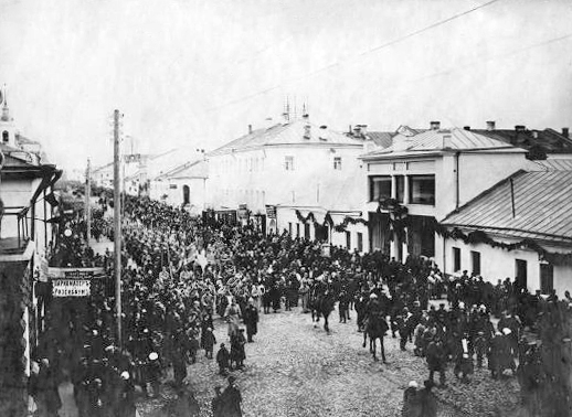 Большая Московская улица. Около 1913 г. Слева - почти полностью южная линия Торговых рядов с Бабьими воротами в центре (1790; до перестройки по проекту 1912); на крыше их “решетки” для вывода телефонного кабеля (в 1913 г. над воротами поместилась телефонная станция); над арками - торговая реклама, в том числе “Магазин готового платья И.В. Зубова”, “Готовая обувь, готовое платье Тарасова”.