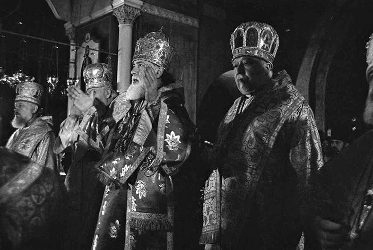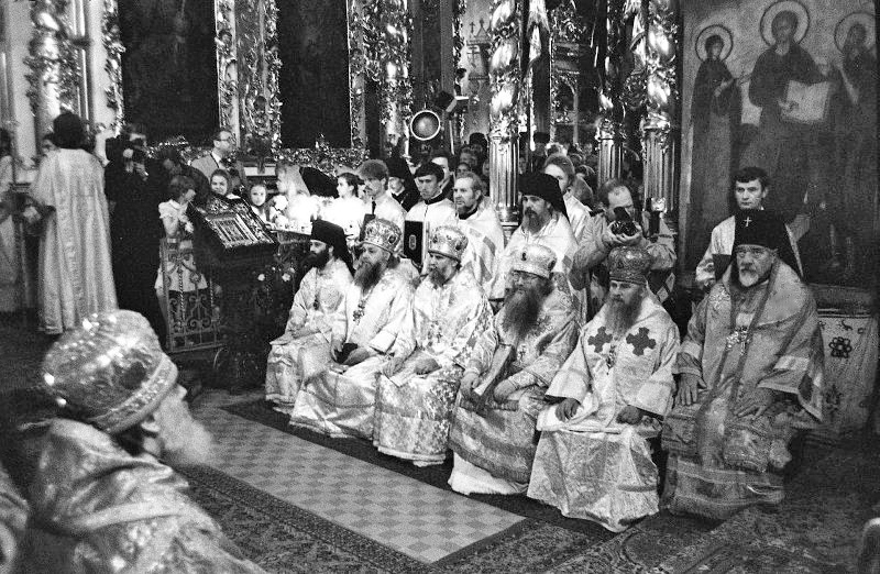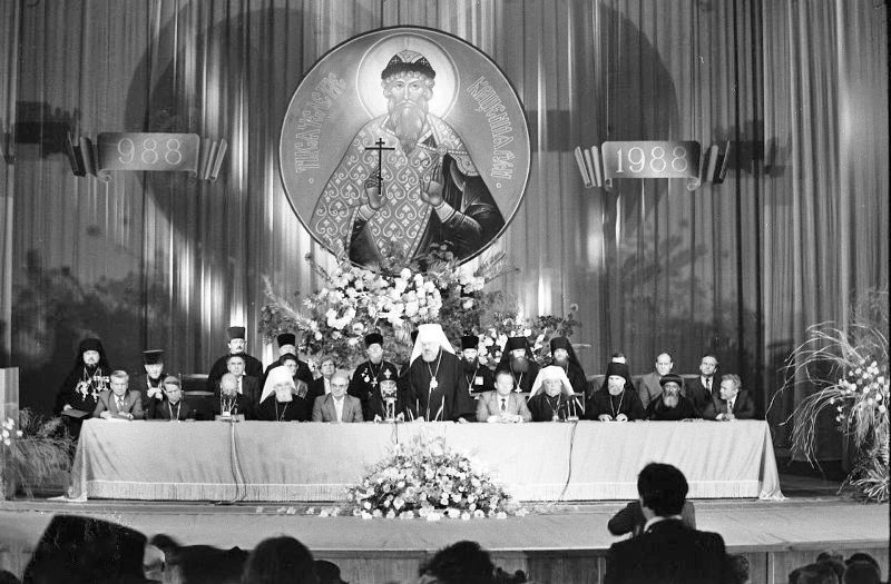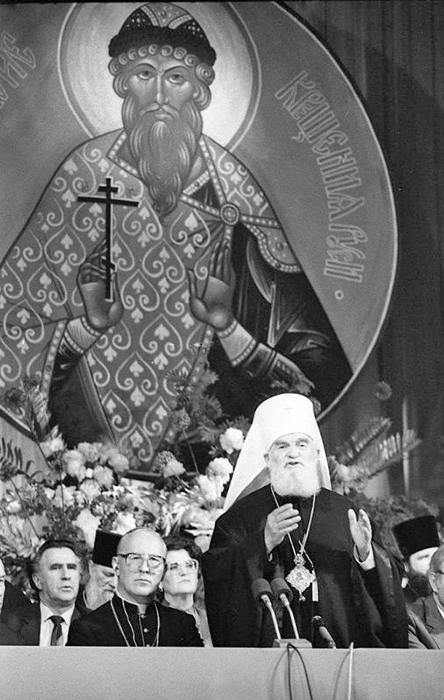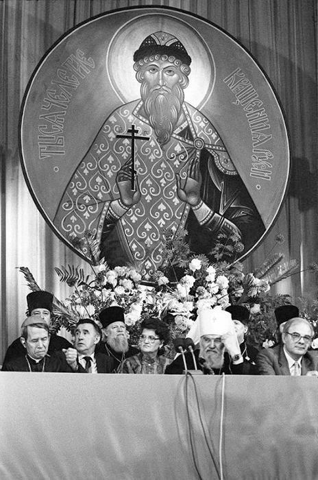 «ПРЕСС-КОНФЕРЕНЦИЯ В МОСКОВСКОЙ ПАТРИАРХИИ 5 июня в Москве начались торжества, посвященные празднованию 1000-лeтия крещения Руси. Накануне в Свято-Даниловом монастыре состоялась посвященная этим событиям пресс-конференция. Выступивший на пресс-конференции митрополит Kиевский и Галицкий Филарет рассказал, что торжества начнутся божественной литургией в Богоявленском патриаршем соборе, которую совершат патриарх Московский и Всея Руси Пимен и члены Священного синода Русской православной церкви. На 6 июня намечено открытие Поместного собора в Троице-Сергиевой лавре в Загорске, который будет работать в течение трех дней. 10 июня в Большом театре Союза ССР состоится торжественный акт, посвященный 1000-летию крещения Руси, и большой праздничный концерт. Торжества пройдут также в Киеве, Владимире, Ленинграде. В течение года они состоятся во всех епархиях Русской православной церкви. На пресс-конференции было сообщено, что в Советский Союз на торжества прибыли делегации более чем из ста государств мира. - Мы предполагали, что 1000-летие крещения Руси будет праздником только Русской православной церкви, но он вылился в грандиозные торжества поистине всех христиан мира,- сказал митрополит Филарет. На пресс-конференции отмечалось, что в подготовке праздника большое содействие Русской православной церкви оказало Советское правительство. Выступившие на пресс-конференции священнослужители подчеркивали, что положительные результаты перестройки и обновления общества получают свое отражение и в жизни Русской православной церкви, других церквей и религиозных объединений страны. Русская церковь благословляет эти начинания и призывает паству принимать активное участие в процессе перестройки. Участники пресс-конференции ответили на многочисленные вопросы советских и иностранных корреспондентов. В пресс-конференции принял участие председатель Совета по делам религий при Совете Министров СССР К.М. Харчев» («Призыв», 7 июня 1988).