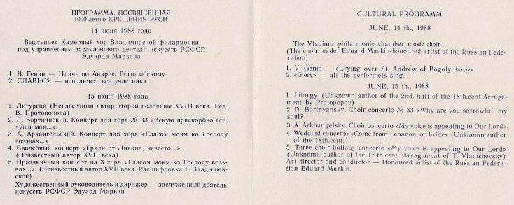 Программа, посвященная 1000-летию крещения Руси 14 и 15 июня 1988 г. в г. Владимире. Выступление Камерного хора Владимирской филармонии под управлением заслуженного деятеля искусств РСФСР Эдуарда Маркина.