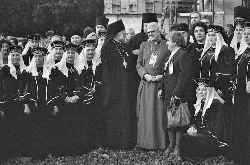 Епископ Владимирский и Суздальский Валентин, примас Англиканской церкви Канады Майкл Джеффри, профессор богословия городов Эрлангена и Нюрнберга Фэри фон Лилиенфельд и участники хора Успенского собора г. Владимира на территории Суздальского кремля. Фото Скуратова Сергея Юрьевича