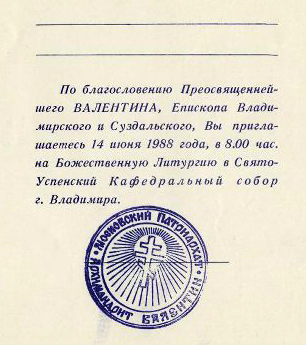 Приглашение в Свято-Успенский Кафедральный собор г. Владимира на Божественную Литургию 14 июня 1988 г.