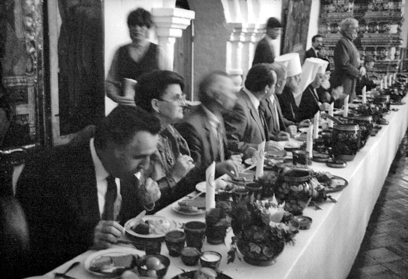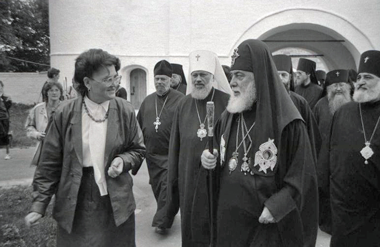 Юбилейные торжества по случаю 1000-летия Крещения Руси. Генеральный директор Владимиро-Суздальского музея-заповедника Аксенова Алиса Ивановна беседует с Католикосом-Патриархом Всея Грузии Илией II во время экскурсии по Спасо-Евфимиеву монастырю. 15 июня 1988 г. Фото Скуратова Сергея Юрьевича