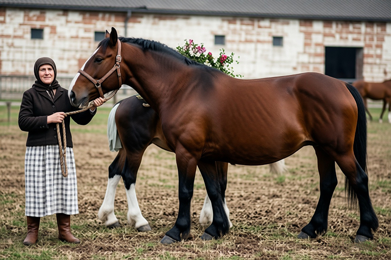Ольга Михайловна Торгова, конюх Турабьевского колхоза, Юрьев-Польского района, с кобылой «Графиней», давшей знаменитых жеребцов «Гранит» и «Гарус».