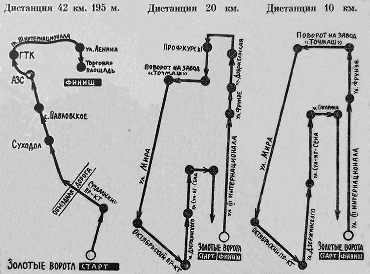 «Вниманию спортсменов и зрителей Никакое крупное спортивное соревнование не обходится без зрителей — владимирцы и гости города завтра станут, ими и выйдут на улицы города приветствовать спортсменов, участников международного марафона «Золотое кольцо России». К их сведению мы публикуем схемы маршрутов. Итак, напоминаем: общий старт в 9.00 у Золотых ворот. Бегуны на 10 километров свернут с ул. Фрунзе на проспект Мира у троллейбусной остановки «Поворот на завод «Точмаш», далее маршрут их пройдет по Октябрьскому проспекту, улицам Дзержинского, Сун Ятсена, Гагарина, III Интернационала. Финиш у Золотых ворот. Бегуны на 20 километров пробегут вместе с марафонцами часть пути по ул. Добросельской, затем, сделав разворот у здания профсоюзных курсов, вернутся назад по маршруту, уже проложенному бегунами десятикилометрового забега, и так же финишируют у Золотых ворот. Бегуны на марафонскую дистанцию 42 километра 195 метров, свернув на Суздальский проспект, продолжат свой путь по автостраде Владимир—Суздаль мимо села Суходол, через Павловское. По объездной дороге перед Суздалем они пробегут мимо туристского комплекса, по улицам III Интернационала и Ленина и финишируют на Торговой площади. На сегодняшний день заявки на участие в забегах подали 1384 человека, среди них 169 женщин; спортсменов Владимира и области — 220 человек, среди них 19 женщин. Готовность № 1 Все готово к проведению первого в истории отечественной легкой атлетики, которая в нынешнем году отмечает свой вековой юбилей, международного марафона «Золотое кольцо России» между городами Владимиром и Суздалем. Сегодня с раннего утра в здании педагогического института у Золотых ворот начнет работу мандатная комиссия, которая зарегистрирует участников марафона и пробегов на 10 и 20 километров по проспектам и улицам города Владимира, выдаст им номера, памятные свидетельства, значки. Размещаются участники соревнований в 17 общежитиях. Освещать ход марафона будут Центральное телевидение, более двадцати журналистов из газет и журналов. Для награждения победителей из Москвы прибывает руководство Госкомспорта РСФСР. По дистанции марафона участников поведут работники ГАИ, на трассах будут машины с бегущей строкой на табло, автомобили медицинской службы, судейской коллегии и средств массовой информации. Болельщикам Владимира и Суздаля, которые будут присутствовать во время торжественного открытия, старта и финиша, работники торговли предлагают сувениры с символикой марафона «Золотое кольцо России»; шапочки, повязки на голову, напульсники, футболки, сумки и многое другое. Итак, марафон объявил готовность № 1» («Призыв», 23 июля 1988).