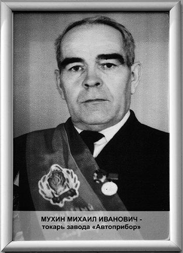 Мухин Михаил Иванович родился в 1911 г. (ныне в Савинском районе Ивановской области). В 1935 году порог Владимирского завода «Автоприбор» перешагнул молодой и довольно симпатичный мужчина 24 лет от роду. Определился в цех №7 токарем. На заводе проработал токарем высокой квалификации вплоть до ухода на пенсию в 1971 г. Все знавшие Михаила Ивановича по совместной работе, отмечают его непоказную скромность. Он никогда не тёрся у трибун, не мозолил глаза начальству. Но если его публично спрашивали о чем-то или речь заходила о чем-то принципиальном, то никогда не увиливал от необходимости высказать свое мнение вне зависимости о того, кого оно может задеть или кому не понравиться. При всей общественной занятости Мухин был человеком домовитым. Самым главным в жизни для него была семья. С супругой Клавдией Андреевной Михаил Иванович жил в любви и согласии, до войны у них появилось трое детей.