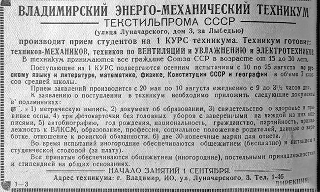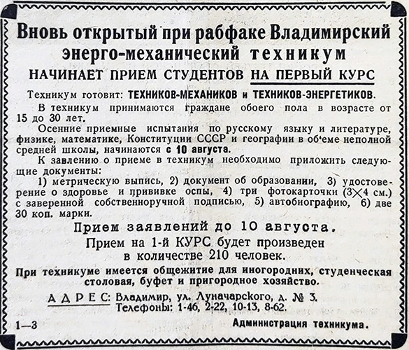 «Начался прием в новый техникум Открытый во Владимире Наркоматом текстильной промышленности энерго-механический техникум начал прием заявлений. Уже поступил ряд первых заявлений. Новый техникум имеет два отделения, на которых будет готовить техников-механиков и техников-энергетиков. Первые будут подготовлены в техникуме для работы начальниками ремонтных отделов хлопчатобумажных фабрик, начальниками механических мастерских тех же фабрик и заведующими вентиляционно-увлажнительными установками. Вторые будут подготовлены для работы в качестве начальников котельных хозяйств, начальников паромашинных, паротурбинных и дизельных станций, начальников электроотделов фабрик и т. д. Продолжительность обучения на том и другом отделениях — 4 года. Общеобразовательные дисциплины на обоих отделениях одинаковы. Одинаковы и следующие специальные дисциплины: технология металлов, текстильные машины, строительное дело, отопление и вентиляция. Только на механическом отделении будут изучаться специальные дисциплины: станки и теория резания, инструментальное дело, технологические процессы и приспособления, допуски и технические измерения и только на энергетическом отделении: паровые котлы, паровые машины, паровые турбины, двигатели внутреннего сгорания. Чтобы подготовить из себя высококвалифицированных советских специалистов, в течение примерно одной пятой части времени пребывания в техникуме студенты будут проходить практику в специально оборудованных кузнечной, слесарной, механической, модельной, электро-сварочной и тепло- технической мастерских. В частности, на первом курсе производственная практика будет проводиться в слесарной и кузнечной мастерских. Эти мастерские уже вполне готовы начать работу с 1 сентября. Кроме того студенты в течение 5-6 месяцев пройдут производственную практику на промышленных предприятиях. Последнюю практику студенты должны будут работать уже в качестве помощников механиков. На первый курс в текущем году всего будет принято 210 человек. Перед коллективом работников техникума стоит задача хорошо, организованно провести набор и поставить так всю свою работу, чтобы из стен техникума выходили полноценные специалисты. И, безусловно, с этой задачей коллектив справится. Директор техникума Фомичов» («Призыв», 6 июня 1939). «ОБОРУДОВАНИЕ ПРОИЗВОДСТВЕННЫХ МАСТЕРСКИХ Вновь организуемый во Владимире энерго-механический техникум Наркомтекстильпрома СССР получил партию оборудования для производственной механической мастерской — токарные, сверлильные, фрезерные, поперечно-строгальные, револьверные и другие станки. Ha-днях это оборудование будет устанавливаться. В ближайшее время начнется также, оборудование кузнечно-слесарных мастерских. На организацию мастерских техникуму отпущено 115 тысяч рублей. В текущем году в техникум будет принято 210 человек. Уже поступило много заявлений от желающих учиться в техникуме» («Призыв», 23 июня 1939).