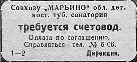«В СОВХОЗЕ «МАРЬИНО» В совхозе «Марьино» до 100 рабочих и служащих. Несмотря на это, в совхозе до сих пор не введено коллективное страхование жизни. В январе текущего года я занялся вербовкой рабочих на страхование. Рабочие, зная, что однажды уже сорвалась подписка, все же охотно записывались. Я заболел, не успев завербовать человек 5-6, а председатель рабочкома т. Горбунов не принял никаких мер и вся работа приостановилась. Здесь сказалось не чуткое отношение к рабочим. При рабочкоме нет также кассы взаимопомощи. Работники облкомитета при своих поездках совершенно не интересуются этими вопросами, да и вообще мало интересуются жизнью совхоза. Сижанов» («Призыв», 30 марта 1938).