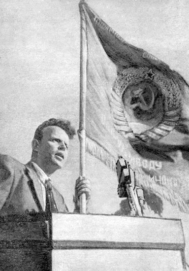 В честь выпуска 10-тысячного трактора на заводе был большой праздник. Лозунги, плакаты, портреты руководителей партии и правительства, цветы и гирлянды из хвои украсили корпуса цехов. На завод съехались многочисленные гости из Министерства, ЦК ВКП(б), из областных и городских организаций, с промышленных предприятий и учреждений города Владимира. В 5 часов на аллее показался новый украшенный букетами цветов трактор с цифрой 10.000. Тракторостроители и гости приветствуют юбилейную машину дружными аплодисментами. Начинается митинг, который открывает парторг ЦК ВКП(б) на заводе тов. Г.Я. Черкевич. ИЗ РЕЧИ ПАРТОРГА ЦК ВКП(б) НА ЗАВОДЕ Г.Я. ЧЕРКЕВИЧА Коллектив Владимирского тракторного завода сегодня отмечает свою производственную победу, спусти с конвейера досрочно юбилейный 10-тысячный трактор. Эта победа знаменательна тем, что до пятитысячного трактора с момента пуска завода прошли годы, а от пятитысячного до десятитысячного - месяцы. Это показывает рост нашего завода, рост наших людей, что показывает на что способны кадры, овладевшие техникой. Идея досрочного выпуска 10-тысячного трактора родилась на рабочих местах: у токарного станка, у кузнечного молота, у пышащих жаром вагранок литейного цеха. И вот наш коллектив с честью выполнил социалистическое обязательство. Нас учит тов. Сталин, никогда не зазнаваться, не кичиться успехами, не останавливаться на достигнутом: остановился сегодня, завтра будешь не первым, а вторым, а послезавтра третьим и очень быстро последним. Мы должны не успокаиваться на достигнутом, а все больше стремиться вперед, неуклонно повышать производительность труда, борясь за культуру производства. Включаясь в предоктябрьское соревнование, мы добьемся новых производственных успехов, дадим сверх плана еще сотни тракторов. *** Слово предоставляется директору завода тов. В.Я. Клименкову. Он рассказывает о путях роста завода с момента выпуска первого трактора, о том, что наш завод и его славный коллектив выросли неузнаваемо и мы способны решать сложные задачи. От имени обкома и горкома ВКП(б), областного и городского Совета депутатов трудящихся с приветственной речью выступил секретарь обкома ВКП(б) тов. П.Н. Алферов. ИЗ РЕЧИ СЕКРЕТАРЯ ОБКОМА ВКП(б) П.Н. АЛФЕРОВА От имени областного и городского комитетов ВКП(б) и от областного и городского Советов депутатов трудящихся разрешите в этот радостный день поздравить вас с производственными успехами. Вашим успехам радуются все трудящиеся нашей области: радуются ковровцы, изготовлявшие для ВТЗ оборудование, радуются муромцы, дающие подъемники, радуются колхозники, которые при помощи тракторов «ВТЗ» добиваются высоких урожаев. Уже в текущем году МТС нашей области получили первые десятки тракторов марки «ВТЗ», выпущенных сверх плана. Вы обещали дать несколько сот сверхплановых тракторов. Надо, чтобы слово не разошлось с делом. Тов. Алферов, передавая привет тракторостроителям от трудящихся Узбекистана, Туркмении и Таджикистана, говорит, что они добиваются больших урожаев хлопка, потому что вы их снабжаете прекрасными машинами, а чем больше хлопка, тем больше текстиля. - Слава славному коллективу Владимирского тракторного завода. Далее тов. Алферов вручает переходящее Красное знамя обкома ВКП(б) и облисполкома, присужденные тракторному заводу по итогам социалистическ