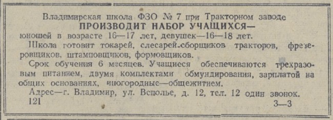 На базе строящегося Тракторного завода в 1943 г. была открыта школа ФЗО № 7, ученики и выпускники которой в обязательном порядке работали на заводе. «Школа ФЗО №7 Владимирского тракторного завода недавно произвела выпуск учащихся. Они овладели квалификацией и необходимыми практическими навыками. Пятая часть выпускников квалифицирована по пятому разряду, 59% - по четвертому и остальные – по 3 разряду. Особо отличились формовщики Фёдоров, Романов, Абросимов и др. Группа девушек-стерженщиц под руководством Вали Филипповой своим отличным старанием завоевала переходящее Красное знамя школы и удержала его до конца выпуска. Школа готовится к новому приему. Отремонтировано учебное здание и инвентарь. Мы встретим новое пополнение в отремонтированном и благоустроенном здании. Н. Васильев» («Призыв», 12 сентября 1945). «Школа ФЗО № 7 при Владимирском тракторном заводе производит набор учащихся по профессиям: токари, фрезеровщики, штамповщики, слесари-сборщики и литейщики. Принимаются юноши 16-17 лет, девушки 16-18 лет… Адрес: Всполье, д. 12» («Призыв», 29 августа 1945).