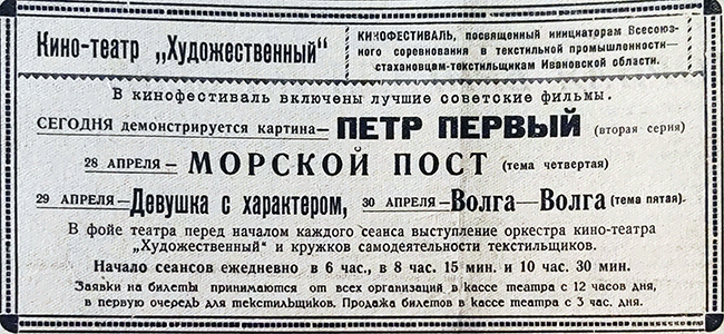 «ПЕРВЫЙ ГОРОДСКОЙ КИНОФЕСТИВАЛЬ С 21 по 30 апреля, по решению обкома партии, во Владимире и ряде других городов области проводится кинофестиваль, посвященный инициаторам Всесоюзного социалистического соревнования текстильной промышленности — стахановцам-текстильщикам Ивановской области. Для кинофестиваля, имеющего большое политическое значение, выделены десять лучших советских звуковых картин, разбитых на пять тем. Первая тема — «Ленин и Сталин — великие вожди революции». По этой теме будут показаны две картины: «Ленин в Октябре» и «Ленин в 1918 году». Вторая тема — «Партия большевиков в борьбе с врагами народа». Будут показаны картины «Великий гражданин» и «Партийный билет». Третья тема — «Героическое прошлое русского народа». Пойдут картины «Петр I» — первая и вторая серии. Четвертая тема — «Защита отечества — долг каждого гражданина СССР». Будут показаны картины «Танкисты» и «На границе». Пятая тема — «Жить стало лучше, жить стало веселее». Пойдут картины «Девушка с характером» и «Волга-Волга». Каждый день кинофестиваля, в течение трех сеансов, пойдет одна из указанных картин. В нашем городе кинофестиваль организуется в кинотеатре «Художественный». Вчера в горкоме ВКП(б) состоялось первое заседание городской комиссии по проведению кинофестиваля. Комиссия наметила план, разработала ряд мероприятий по лучшему проведению кинофестиваля. Решено сейчас же развернуть широкую разъяснительную работу о кинофестивале на текстильных фабриках «Пионер» и «Оргтруд». Билетами на картины в первую очередь будут обеспечиваться стахановцы этих фабрик, во вторую очередь — остальные предприятия и учреждения, а остающееся количество билетов будет продаваться через кассу кинотеатра. Здание кинотеатра к кинофестивалю будет художественно оформлено, внутри театра организуются выставки, посвященные демонстрируемым картинам, а также витрины с портретами лучших стахановцев-текстильщиков. Откроется кинофестиваль торжественным заседанием. Перед каждым сеансом намечено проводить краткие беседы о содержании картины. В фойе будут организованы выступления оркестра театра с новым репертуаром, а также лучших кружков художественной самодеятельности города» («Призыв», 15 апреля 1939).