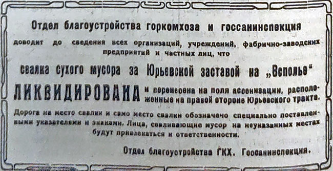 «Исправить дорогу к заводам По направлению к заводам города ежедневно утром, вечером и ночью тысячи рабочих идут на работу и с работы. Чуть ли не каждую минуту снуют по шоссе заводские, городские, колхозные и транзитные автомашины, проходят автобусы, проезжают велосипедисты, едут на базар и с базара сотни колхозников. Казалось бы, этому весьма оживленному участку шоссе горсовет должен был уделить особое внимание. А что мы видим и действительности? Досчатый тротуар, от кузницы до Грамзавода и Химзавода местами прогнил и рабочие ночных смен, идя с работы, рискуют испортить себе ноги. Участок шоссе от хлебозавода до поворота на грамзавод настолько изуродован, что проезд по нему автомашин, закрыт, впредь до окончания ремонта. По соседству с ремонтируемым участком речка Рпень подмыла берег шоссе, перила повисли над обрывом и достаточно человеку покрепче опереться на эти перила — он вместе с ними полетит в Рпень. До сих пор никаких мер к предотвращению размыва шоссе не принято. К неблагоустроенности шоссе еще прибавляется грязь, стекающая в канаву из выгребных ям общежитий «Пионер». Канализационная магистраль к реке часто бывает неисправна и сточные воды выходят из колодцев, разливаясь по канавам шоссе. Посаженные в прошлом году вдоль шоссе молодые деревья, из-за отсутствия присмотра, все поломаны. На всем протяжении шоссе — Москва — Горький вряд ли встретишь такой запущенный участок. Пора горсовету сделать шоссе пригодным для движения» («Призыв», 29 мая 1936).
