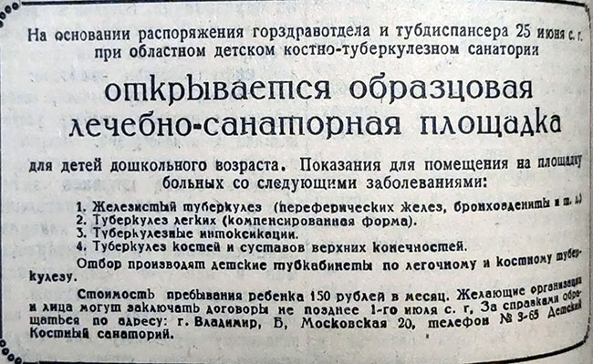 «Новая продукция промкомбината Владимирский промкомбинат осваивает производство столярного и малярного клея и хозяйственного мыла из местного сырья. В начале июля промкомбинат выпустит первые партии новой продукции. Магазин учебных пособий На улице III Интернационала заново отремонтирован и оборудован школьный магазин межрайторга. Стены магазина, полки, витрины окрашены светлыми тонами масляных красок. Магазин имеет в продаже различные учебные пособия для кабинетов: по физике, химии, естествознанию, анатомии и другим наукам. - Новый кабинет по лечению больных малярией открылся при диспансере № 1. Кабинетом руководит доктор Павлов. - При клубе «Автоприбор» открыта радио-аудитория для коллективных слушаний лекций по радио» («Призыв», 10 июня 1936).
