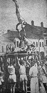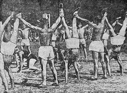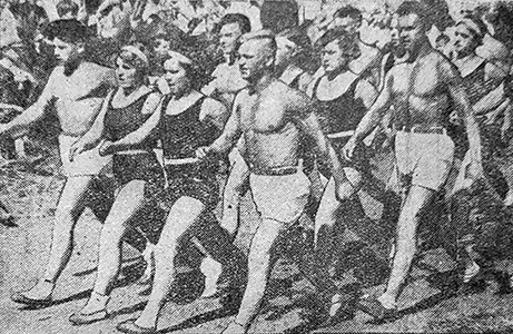 Охотники проходят мимо трибуны, оглашал воздух ружейными залпами. С площади физкультурники направляются на стадион. На улице III Интернационала тесно. Масса публики, физкультурники, оркестры, знамена, лозунги. Город веселился и пел. Это была песня о счастливой жизни в самой прекрасной стране. Бор. Яко. На стадионе Стадион переполнен. Более пяти тысяч рабочих и трудящихся города пришли посмотреть выступления физкультурников. Публика расположилась всюду. На зеленых лужайках, в тени, на солнце. Первыми выступают физкультурники в голубых майках. Это сельско-хозяйственный техникум. Физкультурники рассыпаются по всему футбольному полю. — Смирно! Люди на минуту застыли. Смех и говор стих. Физкультурники под музыку делают упражнения из комплекса «ГТО» второй ступени. Выступает одновременно группа в 400 человек. Вслед за ними на площадку выходят лучшие физкультурники города — студенты техникума физкультуры. Под звуки мелодичного вальса они делают сложные парные упражнения. Безукоризненная чистота исполнения. Публика в восторге приветствует молодые кадры будущих инструкторов физической культуры. Физкультурники сельскохозяйственного техникума цепочкой идут по футбольному полю и строят пятиконечную звезду. В центре звезды строится пирамида. На пьедестал входит девушка физкультурница в шелковом красном костюме. Она с гордостью, поднимает большое красное знамя. Заключительный номер — индивидуальные и массовые сложные упражнения на турниках, брусьях, кольцах исполняют студенты техникума физкультуры. Массовым выступлением на всех снарядах группа гимнастов заканчивает праздник на стадионе. Вечером, когда спала дневная жара, на стадионе состоялась игра Ореховских и Владимирских футболистов. С. Малицкий