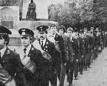 «БОЛЕЕ восьмидесяти молодых представителей областных центров Российской Федерации и ряда союзных республик собрались в это утро на площади Слободы для торжественного открытия конкурса. На груди у каждого из них была красная лента с названием города: Рязань, Москва, Ленинград, Тамбов, Армавир, Воронеж, Иркутск, Йошкар-Ола, Владимир... С водителями Владимирского управления троллейбусного транспорта Володей Куфтыревым и Сергеем Пискуновым мы уже коротко познакомили вас в минувшем номере «Комсомольской искры». Но в это утро я будто впервые увидел их: на каждом темно-синего сукна китель и брюки, форменная фуражка, в петлицах — знаки отличия. Ребята вместе с победителем предыдущего конкурса профмастерства из Рязани Александром Ильичевым возглавляют колонну участников. Торжество открытия конкурса начинается с того, что Александр Ильичев вручает переходящий вымпел IV всероссийского конкурса молодых водителей Владимиру Куфтыреву. С словами приветствия к молодежи обратился начальник главного управления горэлектротранспорта РСФСР В.А. Власов. Звучит торжественная команда: поднять флаг Российской Федерации, символизирующий открытие конкурса. Почетное право поднять флаг предоставлено А. Ильичеву и В. Куфтыреву. Среди почетных участников конкурса в общем строю стоит лауреат премии Ленинского комсомола Узбекистана водитель троллейбуса из города Наманган Обид Агарыков. Накануне я встретил его на улице Комиссарова, где Обид наблюдал за тренировками наших ребят: — Хорошо работают ваши водители. У нас, хоть и областной центр, но база поменьше. Да и маршруты иные. Я, например, работаю на пятом маршруте, его протяженность — шестнадцать километров. Но у нас, не в пример вашему городу, и покрытие дорог похуже, и улочки узкие. Но все это работает на мастерство, ведь в идеальных условиях не может родиться мастер широкого профиля. Что же касается ваших участников, то я особо обратил внимание на их отличные скорости, аккуратность, завидную реакцию, хороший глазомер. Будет хорошо, если наш конкурс станет школой по обмену опытом… Слово предоставлено ответственному работнику ЦК ВЛКСМ А.И. Бочкареву. — Ваш конкурс профессионального мастерства молодых водителей должен стать настоящим праздником труда, хорошей школой по обмену передовым опытом. С пожеланием новых трудовых побед обратились к участникам председатель Владимирского горисполкома М.И. Звонарев, инструктор отдела ЦК профсоюза работников местной промышленности и коммунально-бытовых предприятий Н.Г. Чибирева. И снова наступила торжественная минута. Представителям городов-героев Москвы, Ленинграда, Волгограда, Тулы, а также города Владимира, как организатора проведения конкурса, предоставлено почетное право возложить корзины с цветами к памятнику Владимиру Ильичу Ленину. Закончился митингу посвященный открытию IV Всероссийского конкурса профессионального мастерства молодых водителей. На нем присутствовали заместитель Председателя облисполкома В.В. Долгов, секретарь обкома ВЛКСМ А. Маркин, первый секретарь Владимирского горкома ВЛКСМ Ю. Соловьев и другие ответственные работники. Впереди у участников — трудные этапы соревнований. В. САМОЙЛОВ» («Комсомольская искра», 28 сентября 1983).