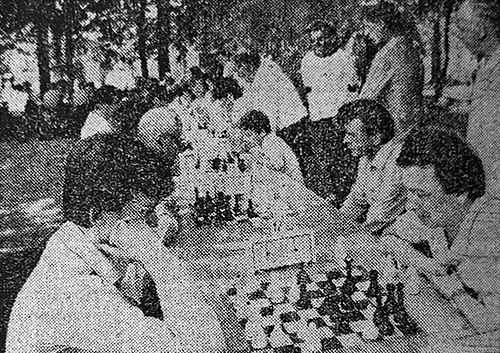 «С УЧАСТИЕМ ГРОССМЕЙСТЕРА И МАСТЕРОВ сегодня и завтра во Владимире пройдет «Праздник шахмат» — Готовясь к проведению этого большого мероприятия, настоящего шахматного фестиваля,— рассказывает директор Владимирского городского шахматного клуба В.В. Рындин, — мы ставили три главные цели: пропаганду шахматной игры и культурного отдыха среди населения области, смотр сильнейших шахматистов Владимирщины, отчеты городских и районных шахматных федераций о работе за последнее время... Разнообразна программа праздника. Начнется она сегодня с международной встречи, в которой сборная Владимира померится силами с командой из города-партнера Эрлангена (ФРГ). Это — вторая встреча соперников. Первая состоялась в сентябре 1986 года во время Дней культуры и спорта Владимира и Эрлангена. Тогда наши шахматисты легко победили гостей. Учитывая это, эрлангенцы теперь привезли сборную во главе с международным гроссмейстером Вольфгангом Унцикером. Есть в их команде и мастера. Сегодня в 16 часов состоится эта интересная встреча. Завтра фестиваль будет продолжен. В парке имени 850-летия г. Владимира, на площади у городского шахматного клуба, состоится интереснейший матч на 100 досках. Сборная города (сто спортсменов: из них 85 мужчин, 10 женщин и 5 гостей из Эрлангена) будет играть со ста соперниками из сборной области, в которую войдут представители Коврова, Гусь-Хрустального, Вязников, Мурома, Кольчугина, Александрова, Собинки, Суздаля и двенадцати районов Владимирщины. Начало этой встречи в 11 часов. Контроль времени 30 минут, т. е. спортсмены будут играть в «активные» (быстрые) шахматы. Здесь же, в парке, пройдут сеансы одновременной игры, матч-турнир команд районов г. Владимира, блиц-турниры, конкурс решения шахматных задач и этюдов. — Мы приглашаем на праздник, — закончил свой рассказ В.В. Рындин, — любителей древней игры из Владимира и гостей города. Уверены, что наш шахматный фестиваль всем понравится... Н. КОЛЕСОВ» («Призыв», 4 июня 1988).