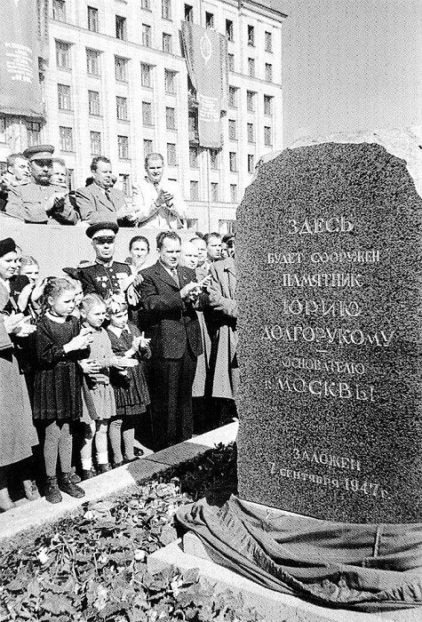 «7 сентября столица нашей Родины—Москва торжественно и радостно праздновала свой славный 800-летний юбилей. С раннего утра улицы наполнились празднично одетыми москвичами. Яркое солнышко, выглянувшее после долгих дней ненастья, озарило помолодевшую и принаряженную столицу. В праздничном ее убранстве запечатлены исторические заслуги Москвы перед Родиной, заслуги, снискавшие славной столице любовь, признательность и уважение свободолюбивых народов мира. Час от часу на улицах становится все люднее. Репродукторы разносят звуки знакомых мелодий. На площадях и бульварах тут и там возникают народные танцы. В 12 часов дня на Советской площади против здания Московского Совета состоялся многолюдный митинг, посвященный торжественной закладке памятника основателю Москвы — Юрию Долгорукому. На площади собрались представители общественности столицы и многочисленные гости — посланцы братских народов нашей Родины. На митинге присутствовали также члены иностранных делегаций, прибывшие в столицу на юбилейные торжества по приглашению Московского Совета. Торжественно и нарядно убранство Советской площади. Над фронтоном здания института Маркса—Энгельса—Ленина в обрамлении знамен — портреты великих основателей Советского государства В.И. Ленина, И.В. Сталина. На балконах окружающих площадь домов — огромные панно, на которых начертаны показатели роста столицы, развитие ее индустрии и культуры в новой пятилетке. Торжественный митинг открывает председатель правительственной комиссии по проведению 800-летия Москвы товарищ Г.М. Попов. — По постановлению Совета Министров СССР, в связи с 800-летием Москвы здесь, на площади, против Дворца Московского Совета будет сооружен памятник Юрию Долгорукому,— говорит товарное Попов.— Наша Родина чтит память великих предков. В лице Юрия Долгорукого мы почитаем выдающегося государственного и военного деятеля древней Руси. Он основал город, который ныне является центром Советского социалистического государства! Затем слово предоставляется президенту Академии наук СССР академику С.И. Вавилову. Вслед за ним выступает поэт И. Тихонов. Митинг окончен. Со всех концов площади несутся возгласы приветствий в честь родного Сталина, в честь граждан великого города — в честь москвичей. Звучит величественный гимн Советского Союза. Его сменяют звуки торжественного марша. Товарищ Г.М. Попов и члены правительственного комитета по проведению 800-летия Москвы направляются к постаменту. Товарищ Попов разрезает ленту. Шелковое полотнище спадает, и перед взорами присутствующих предстает камень розового гранита, на котором высечена надпись: