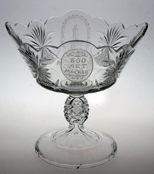 Ваза «800 лет Москвы», сделанная коллективом Гусевского хрустального завода. Егоров Григорий Георгиевич, Мышов Анатолий Иванович (мастер глубокого травления), Чихачев Николай Фёдорович (мастер алмазной грани), Муравьев Вениамин Александрович (мастер-выдувальщик). Ваза «800 лет Москвы», сделанная коллективом Гусевского хрустального завода. Егоров Григорий Георгиевич, Мышов Анатолий Иванович (мастер глубокого травления), Чихачев Николай Фёдорович (мастер алмазной грани), Муравьев Вениамин Александрович (мастер-выдувальщик). Ваза для фруктов с надписью «800 лет Москвы», г. Гусь-Хрустальный. Мастера Мстёры изготовили чудесную шкатулку, верхняя часть которой воспроизведена на фотографии. Ваза, сделанная коллективом Гусевского хрустального завода