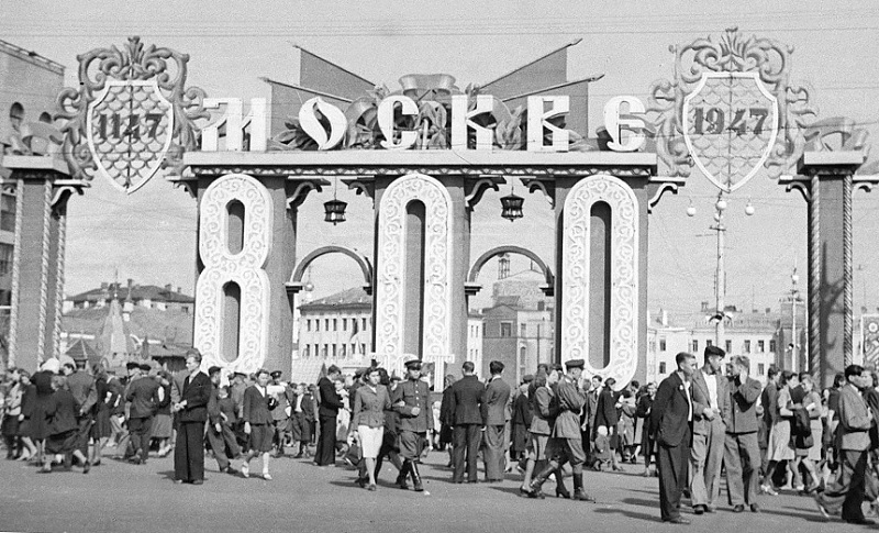 «Здесь будет сооружен памятник Юрию Долгорукому, основателю г. Москвы. Заложен 7 сентября 1947 года». Трудно перечислить все события, которые произошли в этот знаменательный день в столице... В торжественной обстановке прошла закладка 8-ми многоэтажных зданий, которые по решению Советского правительства будут сооружены в столице. Самый высокий дом в 32 этажа заложен на Ленинских горах в центре излучины Москва-реки. Два 26-этажных дома заложены в Зарядье и на Дорогомиловской заставе и пять 16-этажных зданий — у Красных ворот, на Каланчевской улице, площади Восстания, Котельнической набережной и Смоленской площади. Еще с утра, когда не по-осеннему жаркое солнышко не достигло зенита, на Садовом кольце состоялась комбинированная эстафета, протяженностью 16 километров 300 метров. Команда-победительница «Динамо» прошла это расстояние за 38 мин. 21,4 сек. В два часа дня начался народный праздник в честь славного юбилея столицы на стадионе «Динамо». 7200 юношей и девушек приняли участие в спортивном параде на зеленом ковре, устилающем футбольное поле стадиона. Трибуны стадиона переполнены москвичами и их гостями, приехавшими сюда со всех концов громадной советской страны и из-за рубежа. В два часа дня в центральной ложе стадиона появляются тепло приветствуемые собравшимися тт. К.Е. Ворошилов, А.А. Андреев, И.М. Шверник, Г.М. Попов, М.Ф. Шкирятов, С.М. Буденный и другие. Звуки фанфар возвещают начало шествия спортивной молодежи столицы. Парад физкультурников явился внушительной демонстрацией силы, здоровья и красоты нашей молодежи, ее готовности к труду и обороне. Здесь, на стадионе после парада состоялся финиш пробегов ленинградских велосипедистов, мотоциклистов и велосипедистов Белоруссии и легкоатлетов Эстонии, прибывших поздравить Москву с ее славным юбилеем. Затем начались соревнования. По окончании многочисленных и интересных спортивных выступлений состоялся матч на первенство СССР по футболу между командами ЦДКА и «Торпедо». Oн закончился со счетом 1:0 в пользу ЦДКА. Праздник на стадионе «Динамо» с блеском продемонстрировал успехи московской молодежи, прославившей себя в бою и труде, готовой к новым подвигам во славу Москвы, во славу великой и любимой социалистической Родины. На улицах столицы в этот день можно было встретить людей со всех концов нашей Родины. Посланцы народов Советского Союза, принесшие городу-юбиляру сердечные поздравления братских республик, они с восхищением наблюдали народные празднества, сами принимая в них самое живое участие. У всех на устах слова сталинского приветствия Москве. Все гордятся высокой оценкой вождем исторических заслуг Москвы. И это чувство гордости разделяют с москвичами все советские люди, для которых Москва — маяк, озаряющий народам нашей Родины путь к славе и счастью. Ликующие толпы переполнили все магистрали и площади громадного города. На Большой Садовой москвичи с интересом осматривали экспонаты необычной выставки: предприятия столицы демонстрировали на улице образцы своей продукции. На импровизированных стендах, оборудованных на площадках и автомашинах, были выставлены трансформаторы Электрозавода, моторы «Динамо», станки завода «Красный пролетарий», текстиль Трехгорной мануфактуры. Восхищение собравшихся вызвали замечательные, комфортабельные машины, выпущенные автомобил