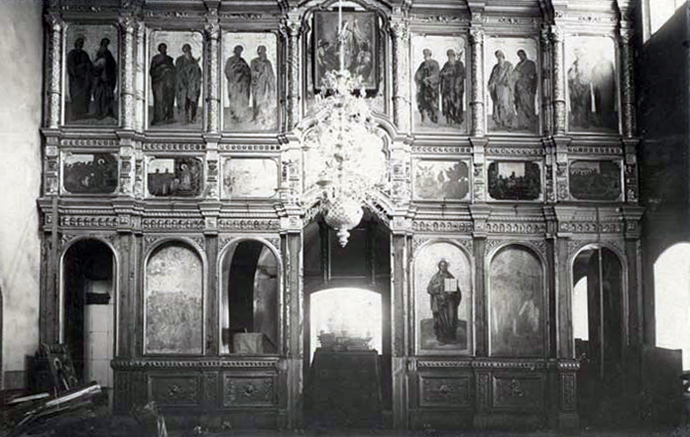 Иконостас теплой Варваринской церкви (нижний этаж). Фотооткрытка. 1916–1928 гг. Ярусный иконостас (XVIII в.). В кадре два яруса высоких икон. Царские врата раскрыты, в проеме виден престол, накрытый скатертью, со стопкой книг и подсвечниками. За престолом алтарная ниша высотой в один ярус икон, с оконным проемом. По сторонам царских врат по две иконы с арочным верхом и раскрытые малые врата. Три иконы сняты: в двух пустых рамах видны простенки, в одной алтарная ниша; колонки между иконами отломаны. Под иконами филенки с розетками. За южными вратами белая кафельная печь. Между высокими ярусами малый ярус с Господскими праздниками. Ярусы разделены карнизами. Иконы 2-го яруса прямоугольные, с парными святыми в рост, между ними рельефные колонки. В центре, над царскими вратами двойная арка, небольшая икона Спасителя с ангелами и паникадило. Слева на переднем плане сложенные кучей иконы; одна – Боголюбской Богоматери – стоит отдельно. Справа простенок с аркой. Снимок, вероятно, сделан вскоре после закрытия церкви в 1928 г. Открытки на фотобумаге бытовали с 1916 г. Надписи. На обороте, чернилами: «Ильинская церковь в г. Владимире. Иконостас теплой церкви (нижний этаж)»; типографским шрифтом: «717021».