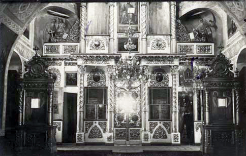 Иконостас холодной Ильинской церкви (верхний этаж). Фотооткрытка. 1916–1928 гг. В небольшом сводчатом помещении (восьмерике) с угловыми тромпами (видны два, со связями), боковыми арочными нишами, аркой в центре и настенными росписями двухъярусный иконостас с накладной золоченой резьбой (XVIII в.). В центре прорезные царские врата с двумя овальными и четырьмя круглыми медальонами. По сторонам по две иконы (их нет, в пустых рамах видна кирпичная кладка) и малые врата между ними. Под иконами и царскими вратами тябла с накладной резьбой. Над иконами овальные медальоны в прорезных рамах. Между ярусами карниз. Во 2-м ярусе Вседержитель, под ним горизонтальная икона в рамке; по бокам по одной иконе, под ними тябла с резными накладками и круглыми медальонами. Между иконами обоих ярусов витые колонки. По краям 2-го яруса поперечные доски с резьбой и резные уголки, за которыми видна роспись на тромпах: слева Матфей с ангелом, справа Иоанн с орлом. В центре паникадило, по бокам напольные резные киоты с иконами, хоругвь. Перед иконостасом солея с круглым амвоном, выложенная метлахской плиткой. Снимок мог быть сделан вскоре после закрытия церкви в 1928 г. Открытки на фотобумаге бытовали с 1916 г. Надписи. На обороте, чернилами: «Ильинская церковь в г. Владимире. Иконостас холодной церкви (верхний этаж)».