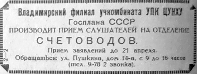 «На улице Пушкина выросло красивое новое здание. Это жилой 48-квартирный дом, строительство которого ведет трест «Владимирстрой». Сейчас здесь идет настилка полов, развертываются штукатурные работы. Первый этаж предназначается под детскую поликлинику» («Призыв», 15 февр. 1958).