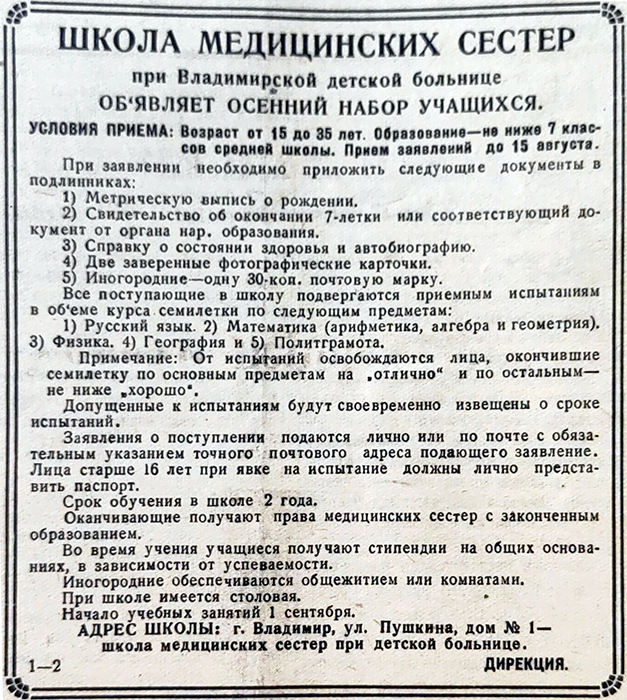 «Кухня должна удовлетворять потребителей. Владимирская молочная кухня обслуживает детскую больницу, консультацию, а также детей в возрасте до 3 лет, которым назначено лечебное питание. В кухне приготовляют цельное молоко, лечебное, какао для ослабленных детей, кашу. Варка молока производится паром в кохерах. В кухне их имеется пять, общей емкостью до 100 литров. Но в настоящее время потребность в молоке возросла, нужно обслужить 1700 человек, поэтому производственный процесс повторяется не один раз в день. Кроме того в тех же котлах приходится стерилизовать посуду, что в свою очередь задерживает производственный процесс. Обслуживающий персонал кухни состоял из 4 человек, таким же он остается и сейчас. До последнего времени кухня снабжалась молоком с гормолзавода. Но несколько дней назад стала снабжаться с Боголюбовского завода. Это делает почти невозможным доставку свежего молока. Кроме того молоко на кухню поступает днем, поэтому отпуск готовых продуктов происходит только вечером, тогда как детишки нуждаются в свежих молочных продуктах с утра. Из рук вон плохо налажена отчетность. Ни от старшей сестры кухни т. Каплиной, ни в бухгалтерии детской больницы нельзя было получить документов об учете розданных продуктов. Системой является списывание на разлив 14 литров в день. Рецептура не соблюдается. Врачи произвольно снижают нормы. Грудные дети, которым молоко выписывают по рецептам, вместо диетического, пастеризованного получают сырое, а иногда кислое молоко. Вместо каши дети получают 25 гр. масла. Ослабленные дети, нуждающиеся в усиленном питании, получают только сладкое молоко. Часто спрос не удовлетворяется, так как кухня не выбирает фондов. Таких фактов не должно быть совсем. Матери теряют в очередях долгие часы. Между тем, в кухне имеются в техническом отношении все возможности для ускорения производственного процесса. Увеличить обслуживающей персонал, оборудовать вентиляцию помещении, организовать своевременную доставку молока — и очередей не будет» («Призыв», 1 июля 1943). «24 января моя дочь попала под автомашину и в бессознательном состоянии была доставлена в 1 советскую больницу. Врач—хирург Потинцев операции не произвел. Целый месяц больная лежала без помощи в ожидании смертельного исхода. Благодаря вмешательству врача т. Шапошниковой, больную перевели в детбольницу. Немедленно была приглашена из госпиталя врач т. Богуцкая. Не считаясь с загруженностью работой, она сделала сложную операцию и сразу облегчила страдания девочки. Сейчас девочка находится еще в больнице, под врачебным наблюдением. Состояние ее хорошее, она вырвана из когтей смерти и заметно поправляется. Я приношу сердечную, материнскую благодарность врачам, своим внимательным отношением, знанием дела и заботой о людях, вернувшим жизнь моей Зое. А. Иванова» («Призыв», 20 июня 1943). «На днях исполняется 25 лет существования Владимирской детской больницы… За четверть века больница пропустила через свои палаты свыше 30 тысяч детей. В тяжелые годы войны при больнице был организован санаторий для ослабленных детей. В нем, под личным наблюдением заслуженного врача республики Ревякина Александра Яковлевича, было возвращено к жизни более 100 детей. К своему юбилею больница приходит с хорошими показателями. Палаты содержатся в образцовой чистоте и порядке. Лечащ