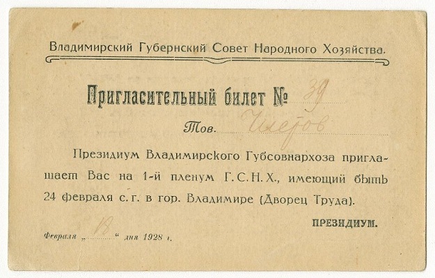 Пригласительный билет № 39 Президиума Владимирского Губсовнархоза на I-й пленум Г.С.Н.Х. 24 февраля 1928 г. во Дворце Труда в г. Владимире Чистову Семену Андриановичу. 18 февраля 1928 г.