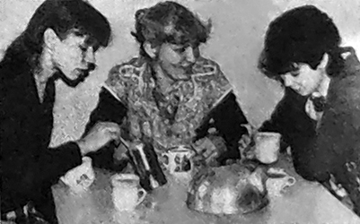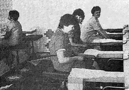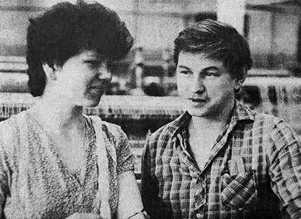 «Ткачиха фабрики имени Володарского Ольга Ивановна Петрова (на снимке слева) в прошлом году перешла на обслуживание 30 новых станков АТПР-120 и сумела достичь высоких показателей в труде. Свой богатый опыт Ольга Ивановна передает молодым рабочим. В октябре прошлого года она взялась обучать ткацкому делу Любу Хашимову (на снимке справа)» («Знамя», 2 февраля 1988).