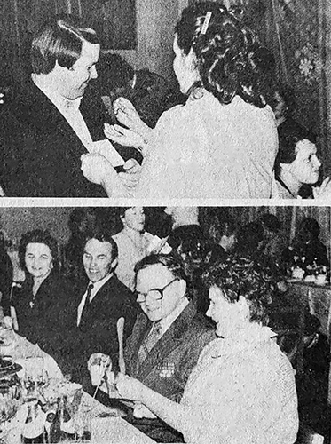 О. А. ГУЗОВА вручает значок и удостоверение общества трезвости мастеру строительного отдела В. А. САФОНОВУ Ветеран войны и труда Г.Г. НАЗАРОВ рассматривает полученный им приз.