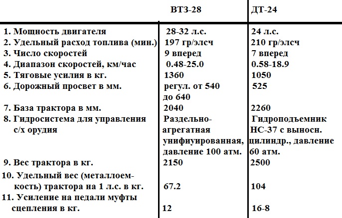 «Наш завод, основываясь на опыте эксплуатации первых партий выпущенных тракторов ДТ-24, осуществил целый ряд мероприятий, позволивших улучшить качество машин. В том числе внедрены электрозапуск двигателя, блокировочные устройства переключения с бензинового на дизельный процесс и укороченный патрубок карбюратора, устранен редуктор заводной рукоятки. С марта 1957 года внедрен в производство алюминиевый поршень двигателя взамен чугунного, что обеспечивает повышение мощности двигателя с 24 до 28 л.с. (номинальная) и 32 л. с. (максимальная), снижение расхода горючего с 218 до 197 гр. э.л.с.ч. Вследствие того, что существующая муфта сцепления не обеспечивает передачу такой мощности, а новая муфта потребовала изменения конструкции трактора и должна быть внедрена в IV квартале 1957 года, в настоящее время мотор отрегулирован на 24 л. с. и снижен расход топлива до 210 гр. э. л. с. ч. Вес двигателя снижен с 515 кг. до 490. Изменены передний брус и лонжероны, что исключило возможные поломки их при перегонах трактора по арыкам. Улучшены конструкция трубчатого вала, а также смазка полуосевых шестерен дифференциала и введено омеднение сателитов. Значительно улучшена гидравлическая система трактора, внедрены новый облегченный тент, счетчик моточасов, новый инструментальный ящик, новое сиденье тракториста, ряд контрольных приборов, улучшены условия заправки горючего и др. Кроме этого разработана новая конструкция остальных узлов трактора. В марте 1957 года изготовлен опытный образец ВТЗ-28 «Владимирец». Техническая характеристика по основным параметрам трактора ВТЗ-28 «Владимирец» в сравнении с ДТ-24 следующая: