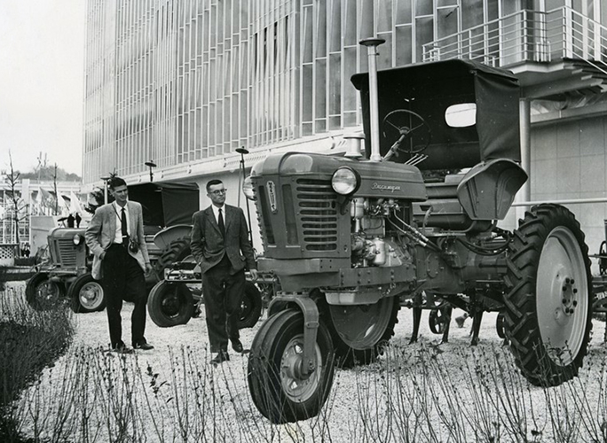 На Брюссельской выставке. На открытой площадке около павильона Советского Союза. Посетители осматривают трактор «Владимирец».