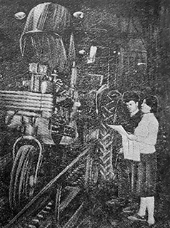 «Индукционный нагрев шатунов В августе в кузнечном цехе окончательно отлажен и введен в действие кузнечно-индукционный нагреватель шатунов двигателя Д-37М. Штамповщики сразу почувствовали преимущество нового метода нагрева заготовок. Нагрев получается стабильным, почти совсем нет окалин. И главное, условия труда улучшились. Нет такой жары, как около газовых печей, культура производства стала выше. Подача заготовок из кузнечно-индукционного нагревателя автоматизирована, а раньше их из печей таскали клюшкой. Электрики участка ТВЧ тт. Болдин, Блинов, Лапшин учат штамповщиков, нагревальщиков, как нам обслуживать КИН, делают надстройку его механизмов, следят за температурой нагрева заготовок. В сентябре будет внедрен индукционный нагрев еще одной детали — вилки кардана. Кузнечно-индукционный нагреватель установлен, заканчивается отладка электросхемы двигателя. Оснастка готова. Перевод вилки кардана с газового нагрева на индукционный улучшит его качество» («Тракторостроитель», 31 августа 1965).