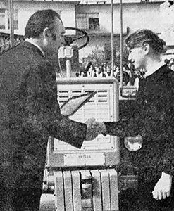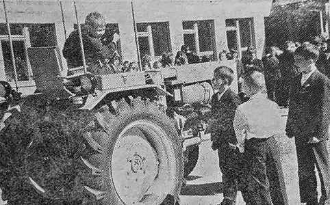 А.М. Думов передает подарок тракторостроителей. Трактор Т-25 на школьном дворе.