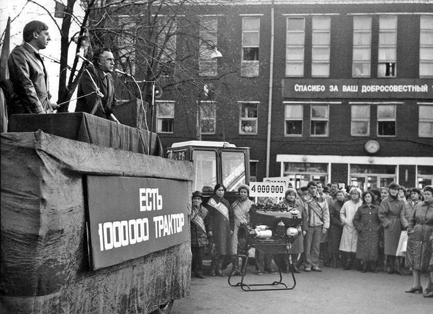 Во вторник, 18 октября, с конвейера сошел миллионный трактор, выпущен четырехмиллионный двигатель. День выдался как по заказу: теплый, солнечный. Мажорная музыка усиливала радостное, приподнятое настроение у сотен тружеников предприятия, собравшихся на митинг, посвященный выпуску миллионного трактора и четырехмиллионного двигателя. 15 часов 30 минут. На площади за заводскими воротами два «именинника» — ярко-красный «Владимирец» и сердце популярной машины — двадцатипятисильный двигатель. К микрофону подходит секретарь парткома завода М.П. Зеленин. Он кратко напомнил историю становления предприятия, рожденного в годы Великой Отечественной войны. От простого, по сегодняшним меркам. «Универсала» до трактора Т-30, отвечающего требованиям мировых стандартов — таков славный путь нашего завода. Машины с маркой ВТЗ пользуются спросом, как в своей, так и в 60 зарубежных странах. Ежегодно с конвейера сходит 36 тысяч тракторов. Это — конкретный вклад коллектива в решение Продовольственной программы, развитие семейного и арендного подряда на селе. Ленинскую мечту о ста тысячах тракторов только один наш завод может теперь осуществить менее, чем за три года. Кстати, первые сто тысяч машин были собраны в августе 54-го. Чтобы изготовить полмиллиона тракторов, понадобилось 34 года. На вторые 500 тысяч — всего 14. С таким ускорением работ наше предприятие! Слова особой благодарности были сказаны на митинге в адрес победителей социалистического соревнования за выпуск миллионного трактора, включенных в символическую бригаду по сборке юбилейной машины. Их около 20 человек. Это — наладчик прессового цеха О.А. Сафонов, наладчик автоматного цеха В. И. Абашкин, шлифовщик моторного цеха № 1 А.В. Нестеров, слесарь-сборщик тракторосборочного цеха Н.В. Баранова, земледел литейного цеха № 4 В.В. Рубцова, электромонтер термического цеха А.И. Каекин, электросварщик цеха кабин В.П. Упорин и другие. Генеральный директор А.В. Гришин от имени руководства объединения поздравил тружеников предприятия со знаменательным событием в жизни многотысячного коллектива и пожелал тракторостроителям новых производственных успехов, благополучия и счастья. На митинге также выступили слесарь-сборщик тракторосборочного цеха 3.А. Земскова, инженер-конструктор ГСКБ, ветеран труда П.М. Тептелев, начальник кузнечного цеха В.В. Толмасов, секретарь комсомольской организации ОГТ Евгений Толпыгин, первый секретарь Октябрьского райкома КПСС В.А. Егоров. Взволнованным было выступление ветерана предприятия М.К. Чуфарина. — Я был среди тех, — сказал он, — кто, если можно так выразиться, — забивал первый колышек в первый трактор «Универсал» на керосиновом двигателе. Еще и завода по сути не было. А продукция выпускалась. Делали ее мальчишки, девчонки и пожилые люди. Помню, как ровно сорок лет назад, в августе сорок восьмого года, радовались мы на этой же площади выпуску десятитысячного трактора. И вот миллионный. Нельзя не гордиться родным предприятием... Бригадир комплексной бригады цеха шестерен Р.М. Семенова зачитала обращение участников митинга ко всем труженикам объединения. В нем содержится уверенность, что коллектив успешно завершит задание третьего года пятилетки, новыми трудовыми победами приумножит славные традиции предприятия. На митинге присутствовал первый секретарь Владим