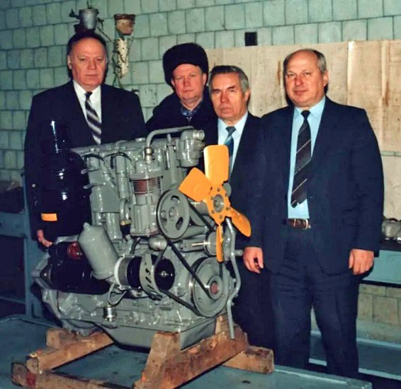 Главный конструктор Каган В. и его сотрудники Муравьёв Василий Фёдорович, Глушков Юрий Иванович и Зуев Николай Иванович у двигателя с жидкостным охлаждением.