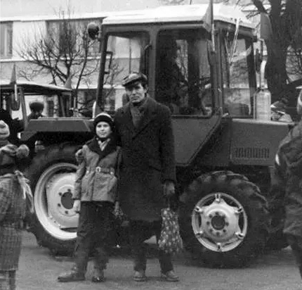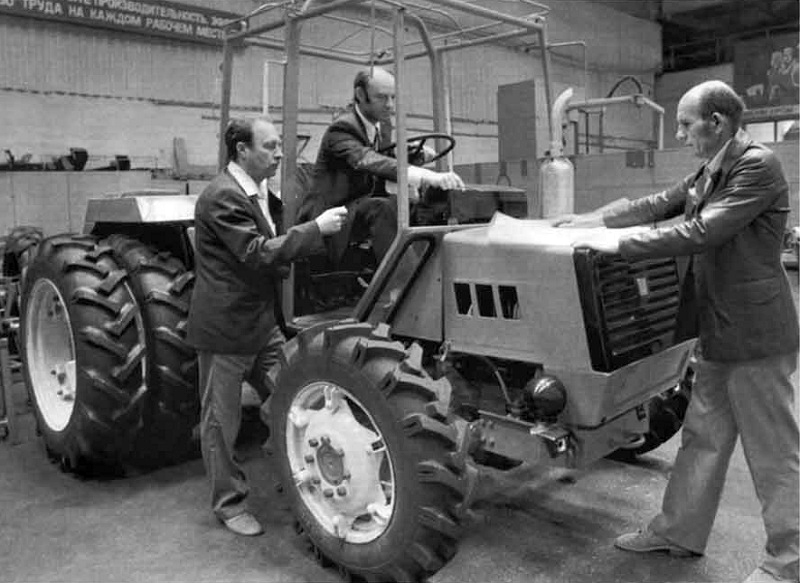 Трактор Т-30А – базовая модель с передним ведущим мостом. Тепличный трактор Т-30АТ. Низкоклиренсный трактор Т-30АН – для работы на склонах. Начальники конструкторских бюро (слева направо) В.М. Катольник и Б.П. Смирнов и ведущий инженер головного СКБ М.Ф. Трындин у нового, крутосклонного трактора Т-30АН. 1984 год