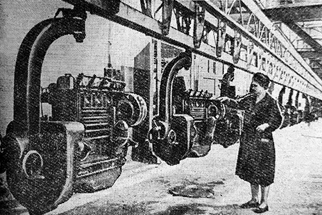 «Десятитонная вступает в строй Сейчас в литейном цехе № 1 с участием бригады Л.В. Крючкова заканчивается подготовка и пуску опытной вагранки с системой подогрева и очистки воздуха по проекту инженера Хомудеса. В вагранку будет поступать воздух, подогретый ее температурой до 250 — 350°С. Несгораемые продукты пройдут через водяную очистительную систему. Преимущества опытной десятитонной вагранки в том, что она в два раза превышает производительность старой и не засоряет атмосферный воздух. Многие технические усовершенствования, осуществляемые ЦНОМА, направлены на повышение качества выпускаемой продукции. С этой целью в кузнечном цехе возводится агрегат нормализации. В нем заготовки после ковки пройдут процесс нормализации, то есть, нагрев до определенной температуры и охлаждение на воздухе. Для участка коленчатого вала моторного цеха № 1 изготовляется и монтируется система монорельсов и подвесная дорога. Члены бригады тов. Рузина изготовили колонны для подвесной дороги. Но монтаж задерживается из-за того, что нет металла. А. М. ГОЛУБЕВ, старший технолог ЦНОМА» («Тракторостроитель», 12 мая 1964).