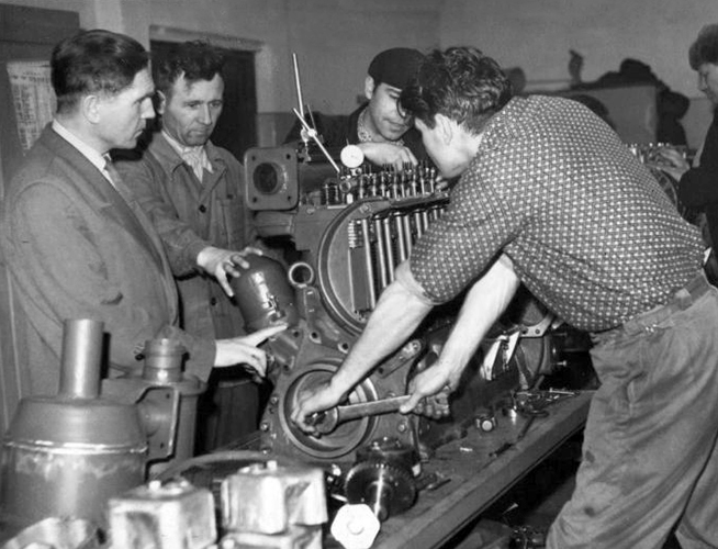 «Школа передового опыта Эта школа создана при техническом кабинете завода по инициативе бюро технической информации и отдела подготовки кадров. Работает школа один раз в месяц. В соответствии с тематикой к каждому занятию организуется выставка натуральных экспонатов, технической литературы, литературы по технической информации и патентов. Первое занятие состоялось 26 декабря 1964 года. Оно было посвящено вопросу о производстве точных заготовок в литейных и заготовительном цехах. С докладами на эту тему выступили заместитель начальника литейного цеха № 4 тов. Макаров и заместитель главного металлурга тов. Нечипуренко. Практические занятия были перенесены из техкабинета в литейные и кузнечный цехи, где слушатели могли видеть, как изготовляются точные заготовки крышки распредшестерен, цилиндров, шатунов. На втором занятии, состоявшемся 14 января, слушатели ознакомились с прогрессивным методом пластической деформации в чистовой обработке деталей. Занятия открыл главный технолог завода тов. Игошин. Сообщение о методе пластической деформации сделал начальник лаборатории резания металлов тов. Дроздов. Он рассказал о преимуществах новой технологии, обработке методом пластической деформации анкерных и бугельных шпилек, отверстия под поршневой палец, поверхности втулок верхней головки шатуна и др., о целесообразности более широкого внедрения этого метода на заводе. Второй докладчик — начальник конструкторского бюро отдела главного конструктора тов. Салов остановился на вопросе об эксплуатационных преимуществах деталей, обработанных методом пластической деформации Износостойкость их увеличивается на 50 — 60 процентов. На выставке были представлены детали 14 наименований, обработанных новым методом, в том числе шатун, поршень в разрезанном виде. Слушатели — новаторы, мастера, технологи, начальники БТК могли наглядно видеть их преимущества. Патентный отдел областной библиотеки и техническая библиотека организовали выставку патентов, материалов технической информации и новинок технической литературы по теме занятий. После слушателей пригласили в лабораторию резания, где им продемонстрировали накатку гантелей коленвала, накатку поверхностей под шатунный болт и др. Практическими занятиями руководил начальник лаборатории резания тов. Дроздов. В автоматном цехе слушатели ознакомились с работой участка по обработке бугельных шпилек, а в моторном цехе № 1 — с обработкой анкерной шпильки методом пластической деформации и др. В результате работы школы передового опыта было принято положение о дальнейшем внедрений нового прогрессивного метода, и также соблюдении технологического режима при обработке деталей этим методом. О. СЕЛИНА, К. МИХАЙЛОВА» («Тракторостроитель», 26 января 1965).