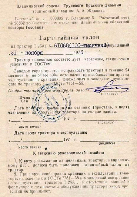 Передача 100000-го трактора Т-25А лучшему механизатору колхоза «Смена» Никитину М.А. 1975 г. Фото: Архипов Владимир Яковлевич Гарантийный талон на юбилейный трактор Т-25А1 1975 г.