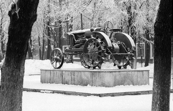 «НА ВЕЧНУЮ СТОЯНКУ Будучи летом прошлого года в Орджоникидзе — столице Северной Осетии, я зашел в местный краеведческий музей. Каково же было мое удивление, когда с группой экскурсантов мы подошли к выставленному в зале экспозиции послевоенного периода трактору. Им оказался «Универсал», выпущенный на нашем заводе. Так на далеком Северном Кавказе я встретился в музее со своим земляком — трактором, изготовленном к тому же на моем заводе. Со слов экскурсовода узнал, что этот трактор белее 20 лет проработал на полях Северной Осетии — срок значительный, особенно если учесть горный рельеф местности, Услышал, что труженики этого края благодарны тракторозаводцам из далекого Владимира, обеспечивших их тракторами в трудные послевоенные годы. Тогда мне подумалось: «В Орджоникидзе наш «Универсал» поставили в музей. Почему же у нас на заводе нет пьедестала, где бы стоял наш первый трактор?» И вот настал день 18 мая. Торжества, посвященные 40-летию завода. На постамент торжественно водружен трактор первой модели «Универсал-2». Перед этим он находился в экспериментальном цехе. Свежевыкрашенный и полностью укомплектованный, он казался только что сошедшим с заводского конвейера. Откуда же он взялся — новенький «Универсал-2» сейчас, через четыре десятилетия? Около двух месяцев назад в экспериментальный цех был доставлен трактор «Универсал-4». Образца первой модели, к сожалению, не нашлось. Имелся только этот «Универсал-4» — модель более позднего выпуска. Кстати, это тот самый трактор, который владимирцы помнят по его участию в празднествах, посвященных 875-летию города Владимира. У этой модели имеются отличия от первого трактора. «Универсал-4» — подрезиненная трехколесная машина, а модель трактора «Универсал-2» четырехколесная. Две недели трудились рабочие, выполняя заказ к юбилею завода. Пришлось заново изготовить передний мост на два колеса, тяги, шипованные задние колеса и некоторые другие детали. При этом отличились слесари В. Ветров и В. Перепекин, шлифовщица В. Караванова, фрезеровщики В. Кузнецов и П. Баранников. Жестянщики братья Боршевские отрихтовали новые задние крылья. Сборщики тракторосборочного участка К. Цырулев, Н. Кириллов, А. Монахов, Ю. Иглов все части и механизмы смонтировали воедино. Маляры А. Чуриков и Н. Пуцилло покрасили готовый трактор, и вот сверкая, как новенький, «Универсал-2» был готов отправиться на свою последнюю стоянку, на постамент. На вопрос, как можно оценить результат работы по восстановлению трактора, мастер тракторосборщиков А. Филиппов ответил: — Трактор полностью восстановлен, его внешний вид соответствует «Универсалу-2», причем трактор на ходу. К стоянке, правда, ехать машине своим ходом не пришлось из-за шипованных задних колес. В. ТАБОЛИН» («Тракторостроитель», 24 мая 1985).